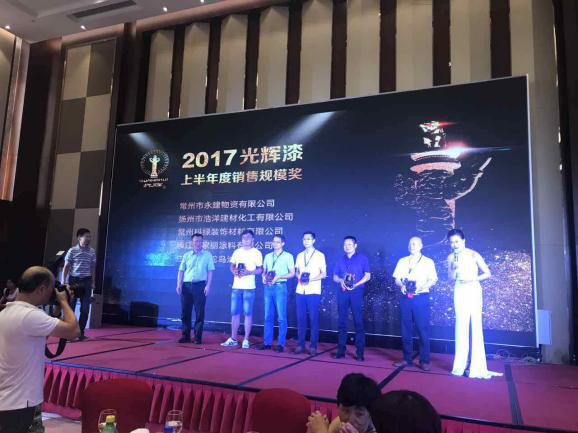 會議表彰了前5大規模經銷商和前5位增量經銷量,并頒發了獎牌和獎金。通過所有經銷商的共同努力,公司銷售業績較去年同期有所增長。光輝水性漆體系通過5年時間的調整和磨合,已日趨完善。公司重點推介的水性調合漆、水性鋼結構漆、水性工業漆等產品既順應了市場發展,又是大家經濟增長的突破點。會議希望所有經銷商抓住水性漆機遇,在老市場、新市場競爭區域和環保要求高的上海、蘇州、杭州區域開發更多新的客戶,提高光輝漆市場占有率。